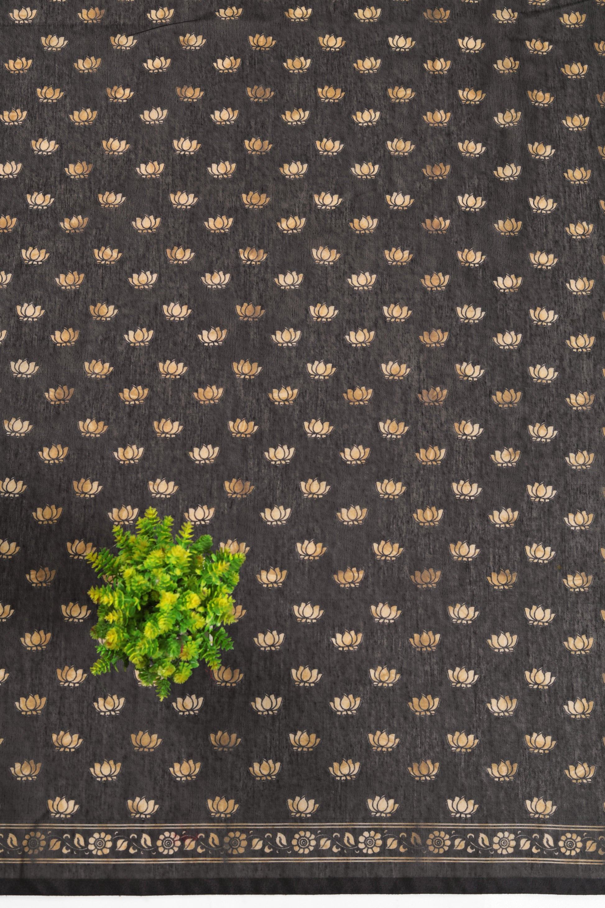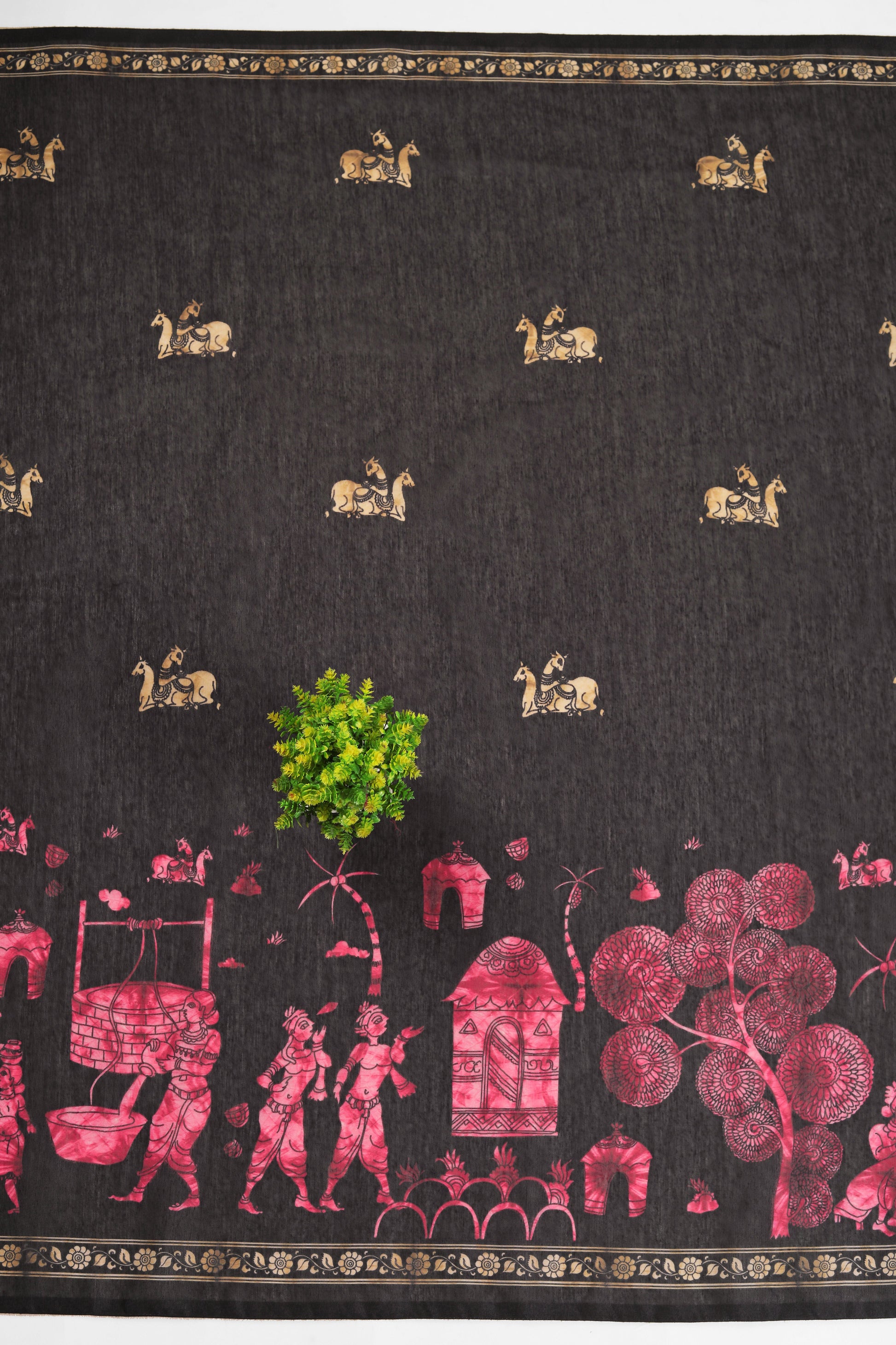 Drape yourself in art with the Chitrika Neelkamal saree. Crafted in soft Chanderi cotton, this black saree is brought to life with hand-painted motifs of peacocks, deer, and floral lotuses in soothing turquoise-pink tones. The intricate pallu showcases forest-inspired storytelling, making it perfect for festive occasions, cultural gatherings, or an elegant everyday statement. Lightweight, breathable, and effortlessly graceful – this saree blends heritage artistry with modern charm.