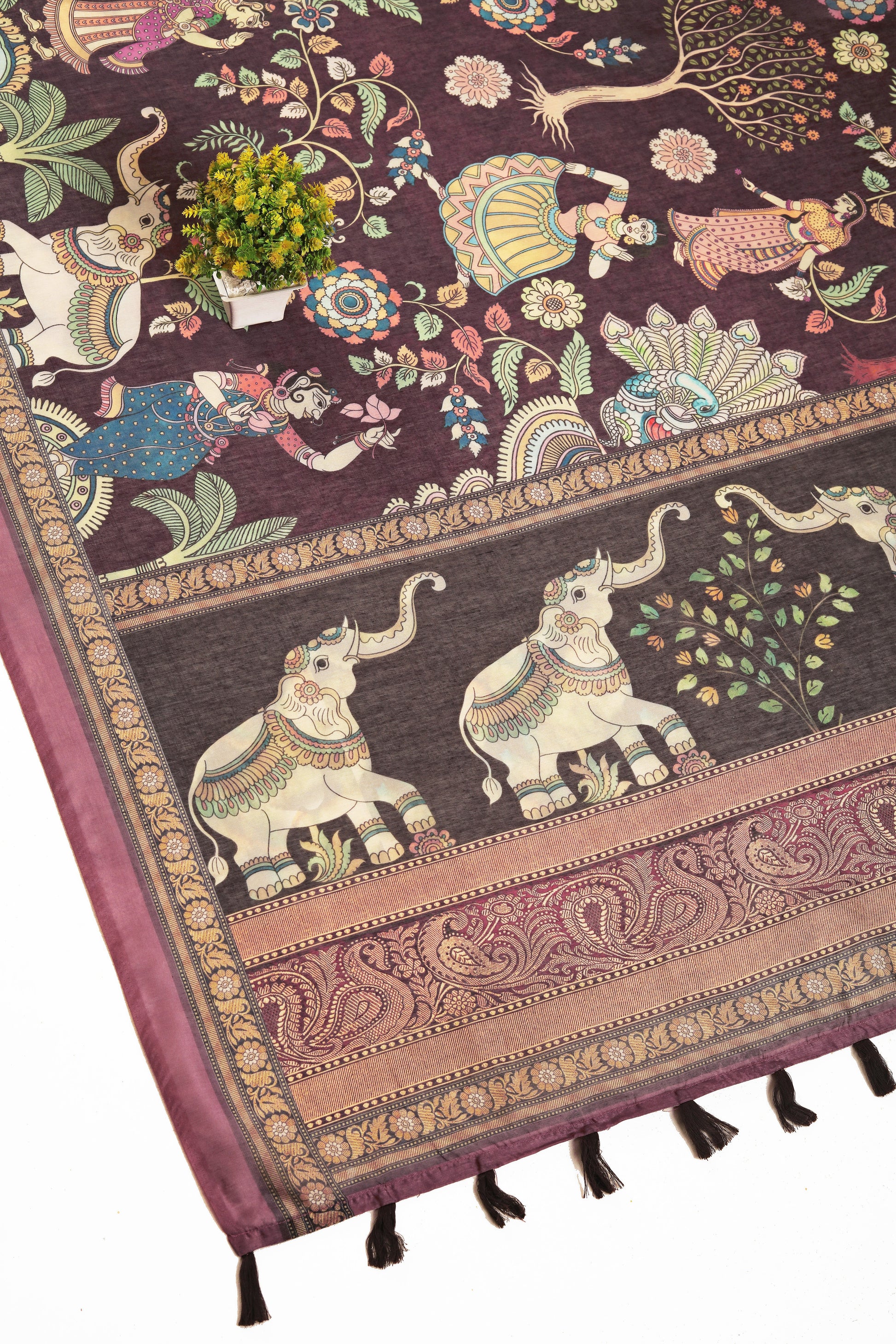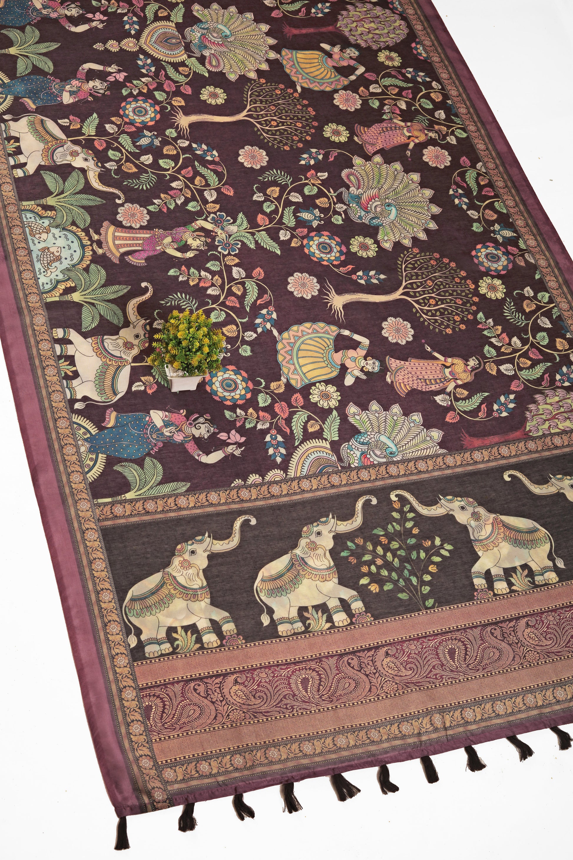 A rich plum backdrop sets the stage for 'Gajleela' — a vibrant celebration of royal elephants, blooming flora, and graceful dancers. Intricate folk-art prints unfold like a storybook across the drape, accented with peacocks and paisleys. Woven in lightweight Chanderi cotton, it’s perfect for cultural soirées and festive elegance.