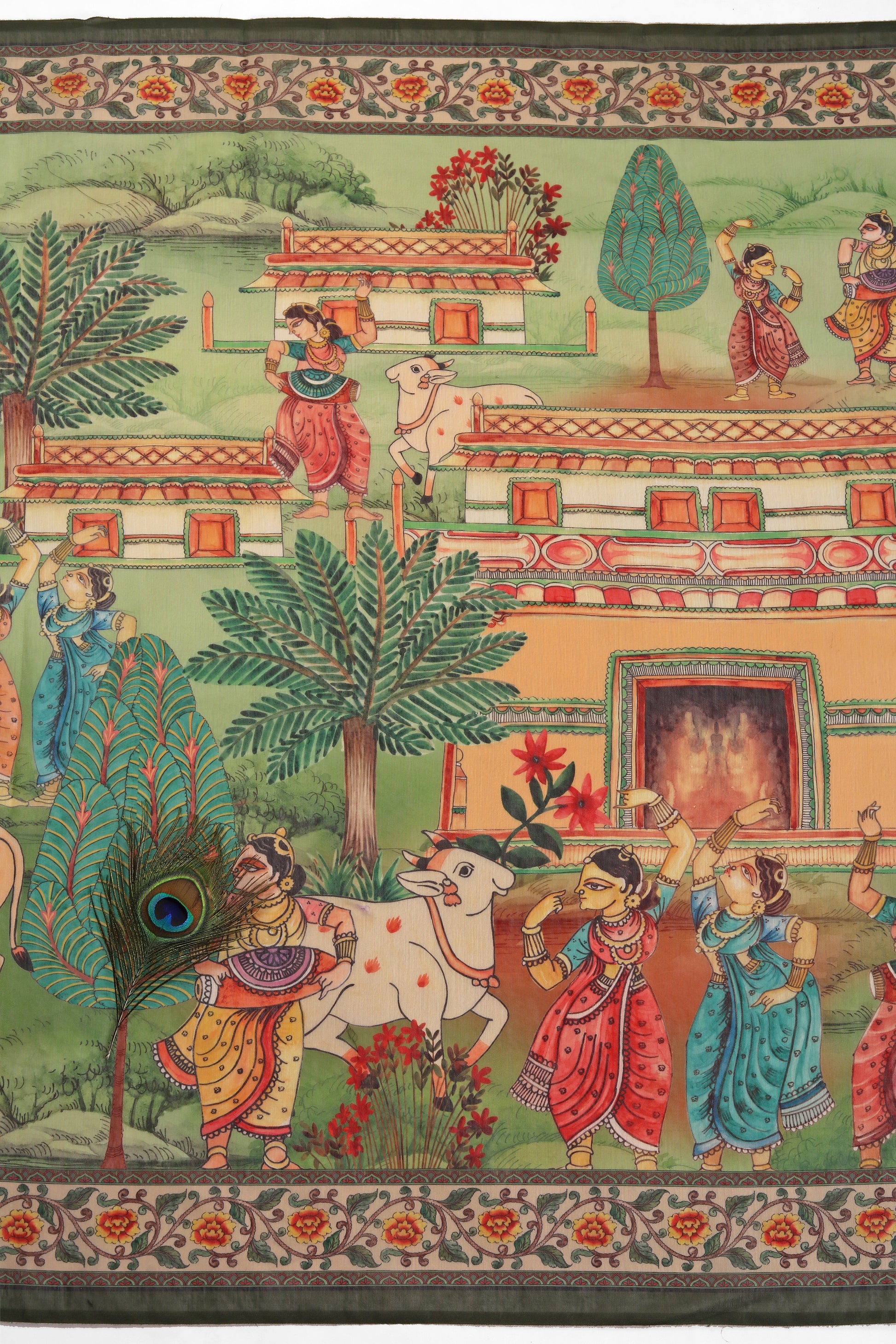 Celebrate the eternal rhythm of devotion with our Gopi Raas Chanderi Saree. Featuring Krishna with his flute amidst gopis, cows, and lush Vrindavan scenery, this saree brings alive the divine energy of Rasleela. The border showcases dancing gopis in vibrant hues, making it a true wearable artwork of joy and devotion. Crafted in lightweight Chanderi cotton, it drapes with grace and comfort. Perfect for festive occasions, temple visits, and cultural gatherings, this saree carries the essence of Vrindavan’s sacred dance.
