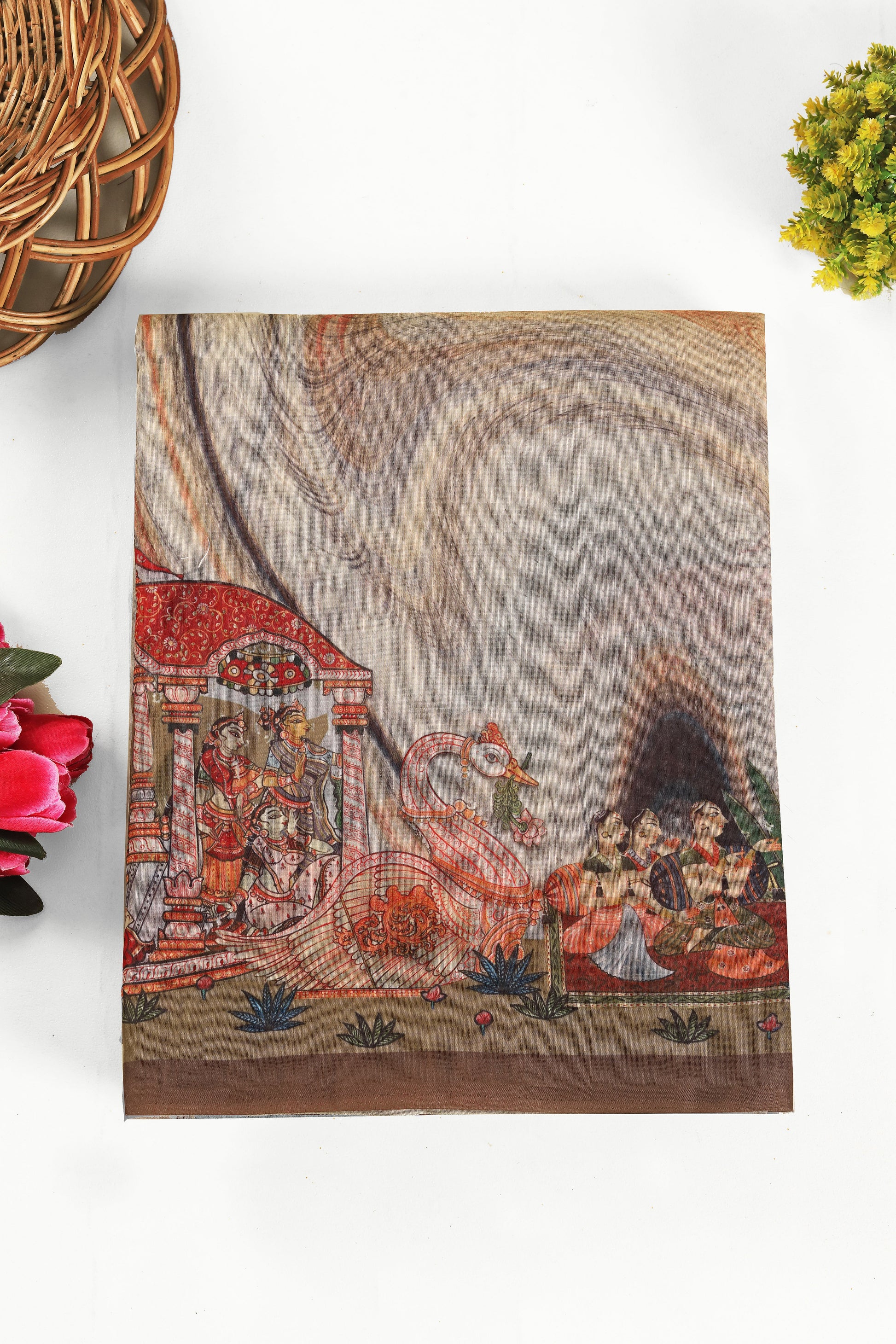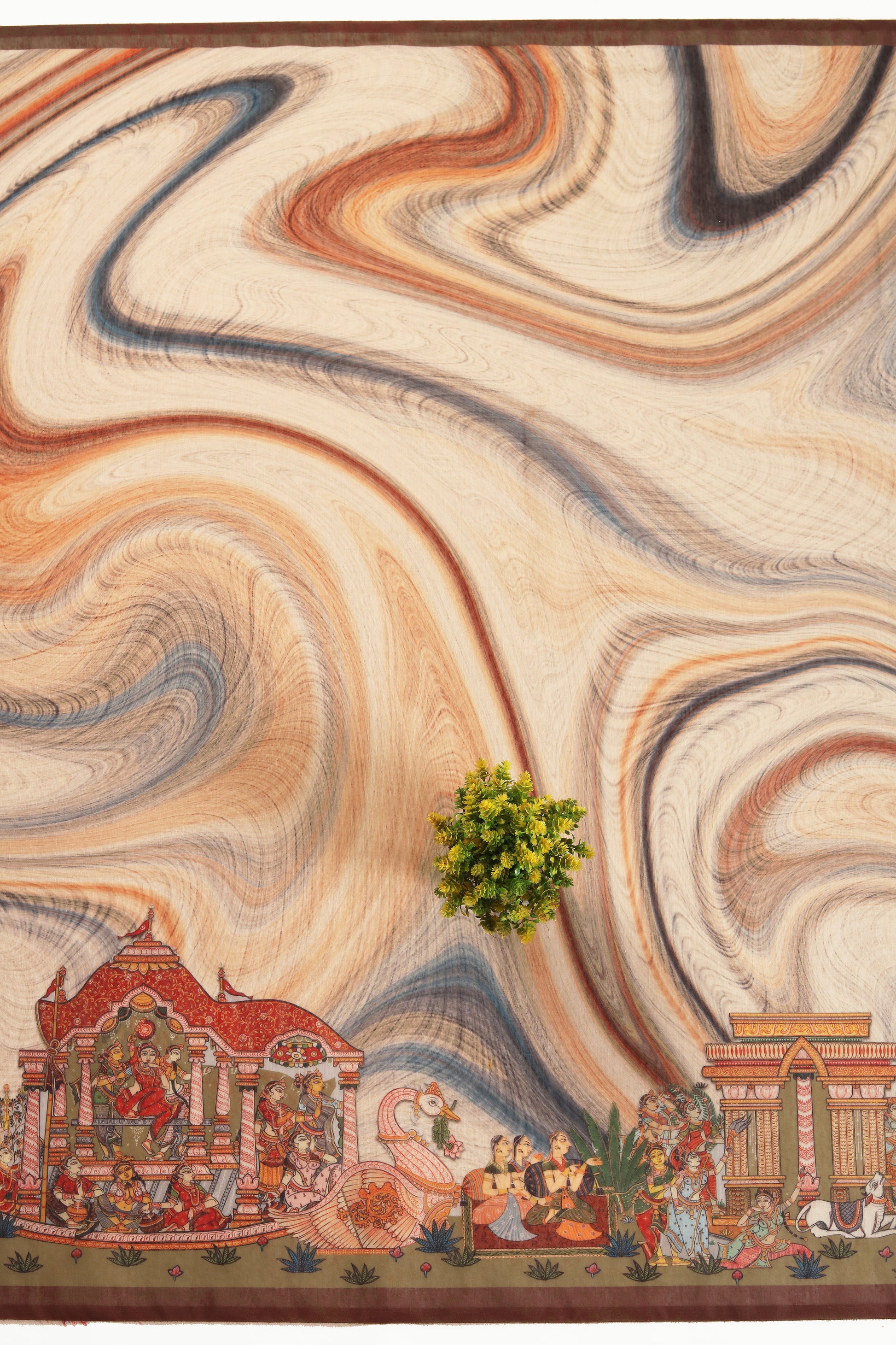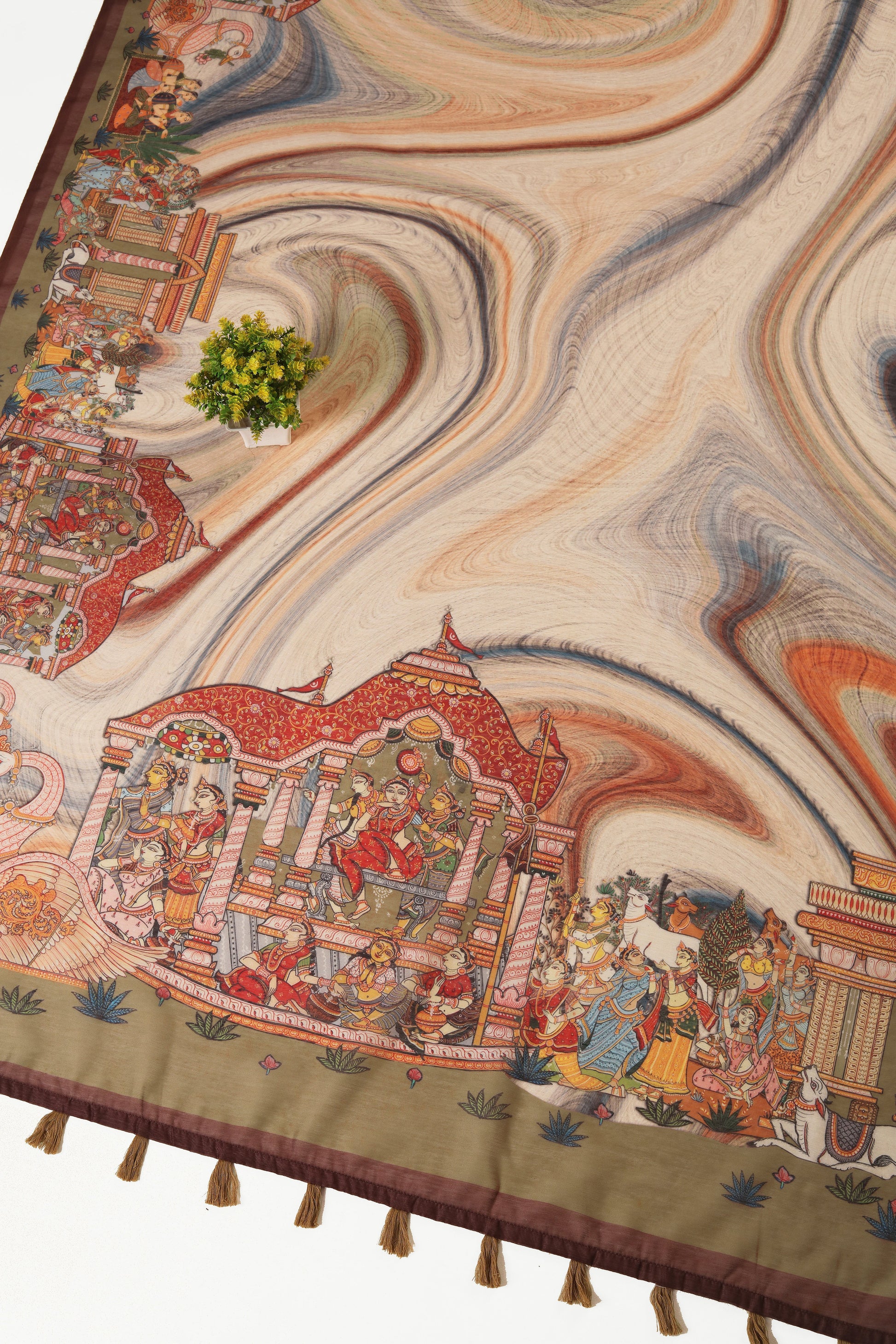 This exquisite saree weaves a tale through its intricate border illustrations, depicting scenes from ancient lore. The flowing, marble-inspired body complements the narrative art, creating a piece that's both visually stunning and rich in cultural storytelling.