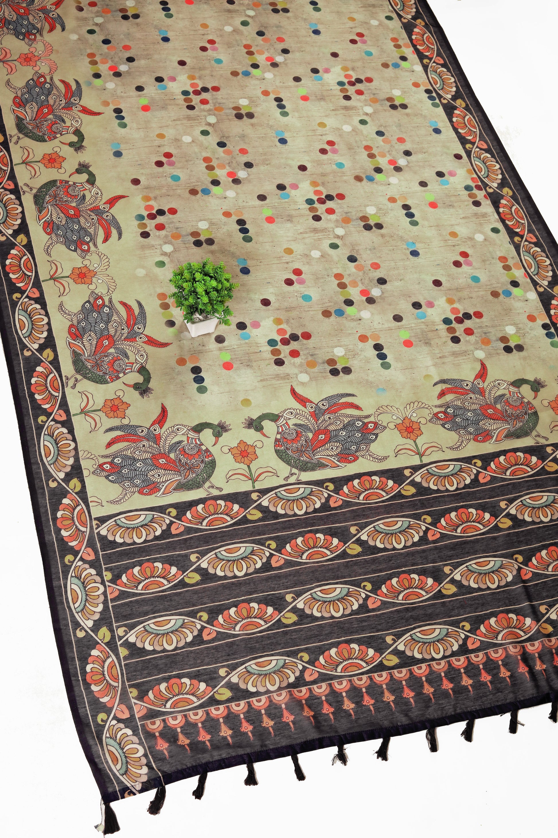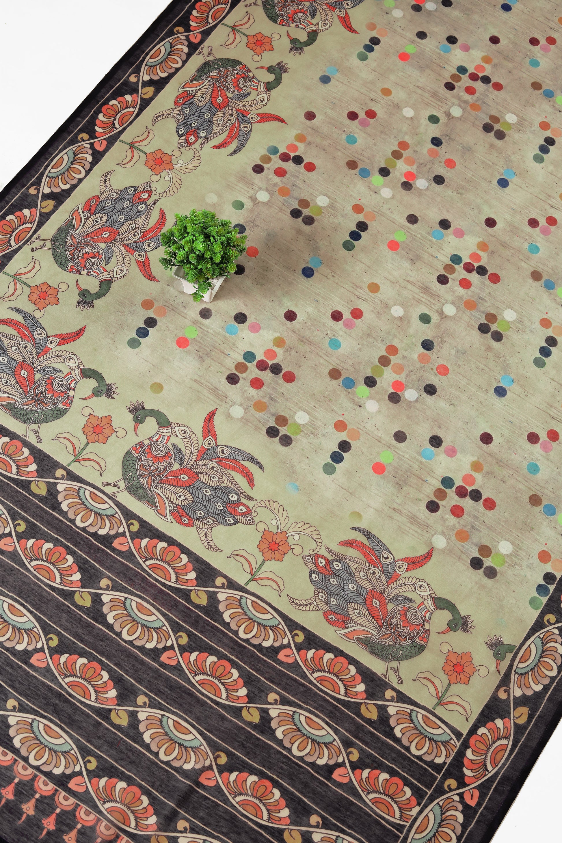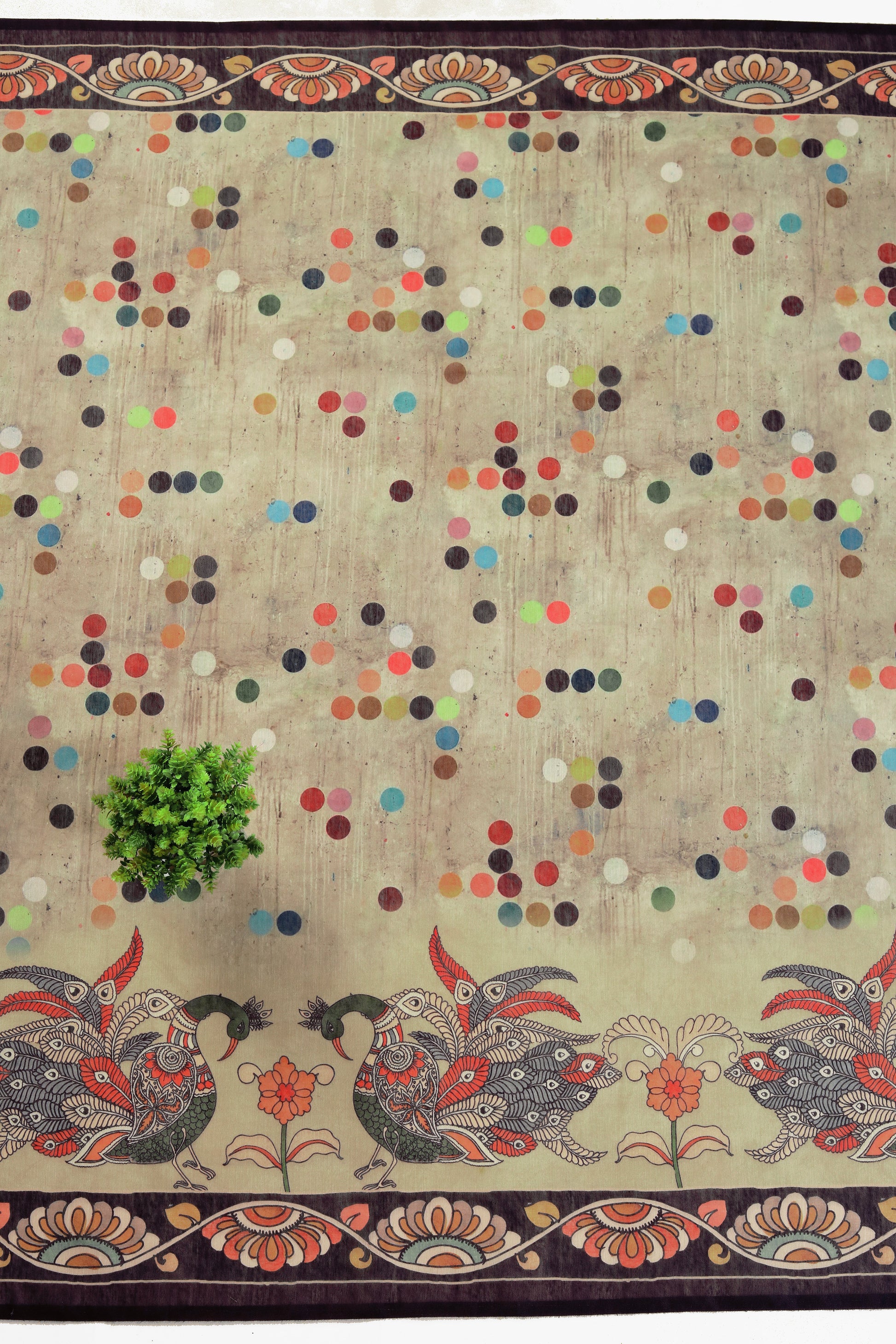 This saree elegantly combines the regal beauty of peacocks ("Mayura") with a contemporary, dotted ("Bindu") pattern. The border showcases intricately designed peacocks, a classic Indian motif, while the body features a modern arrangement of dots, creating a harmonious blend of tradition and modernity.
