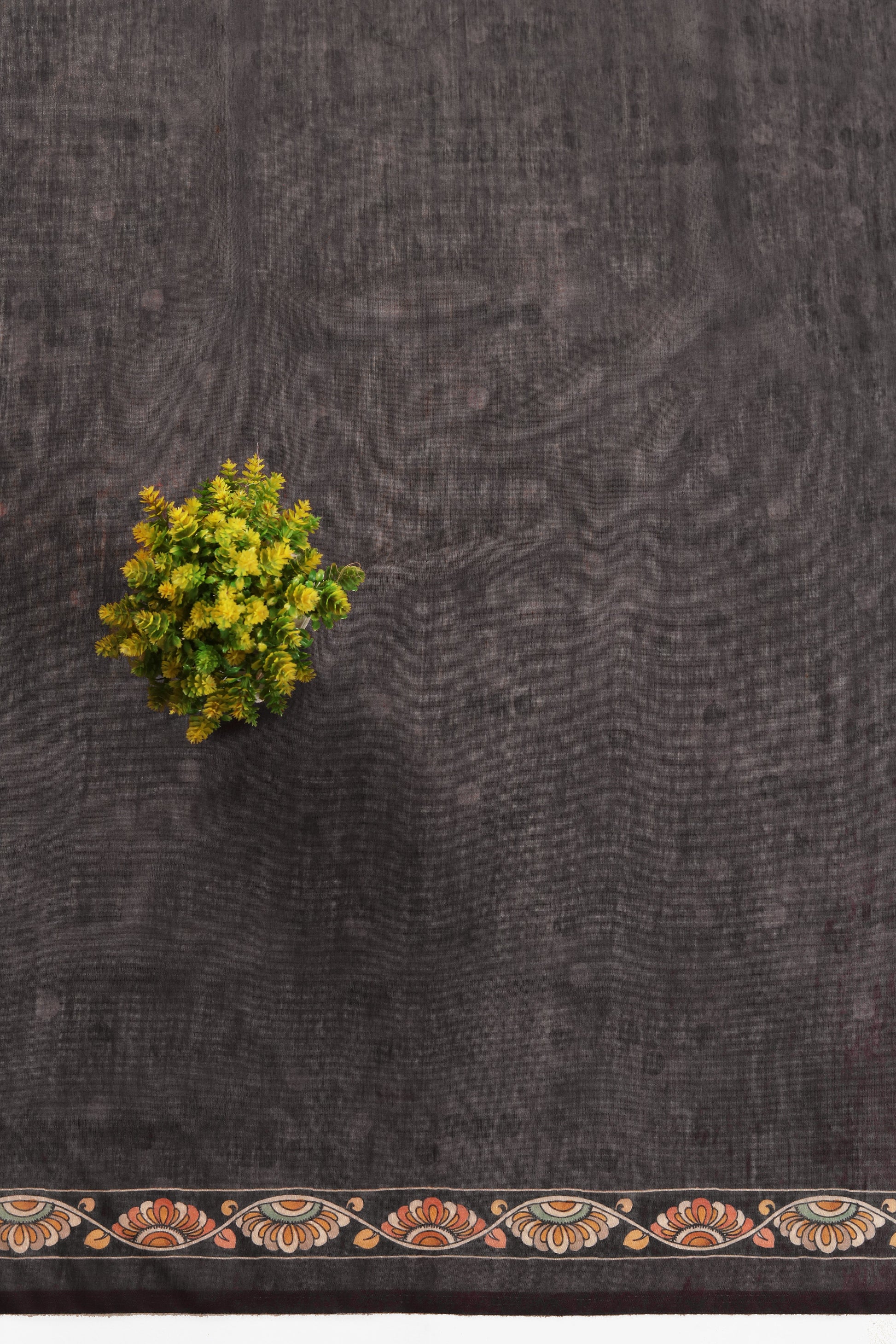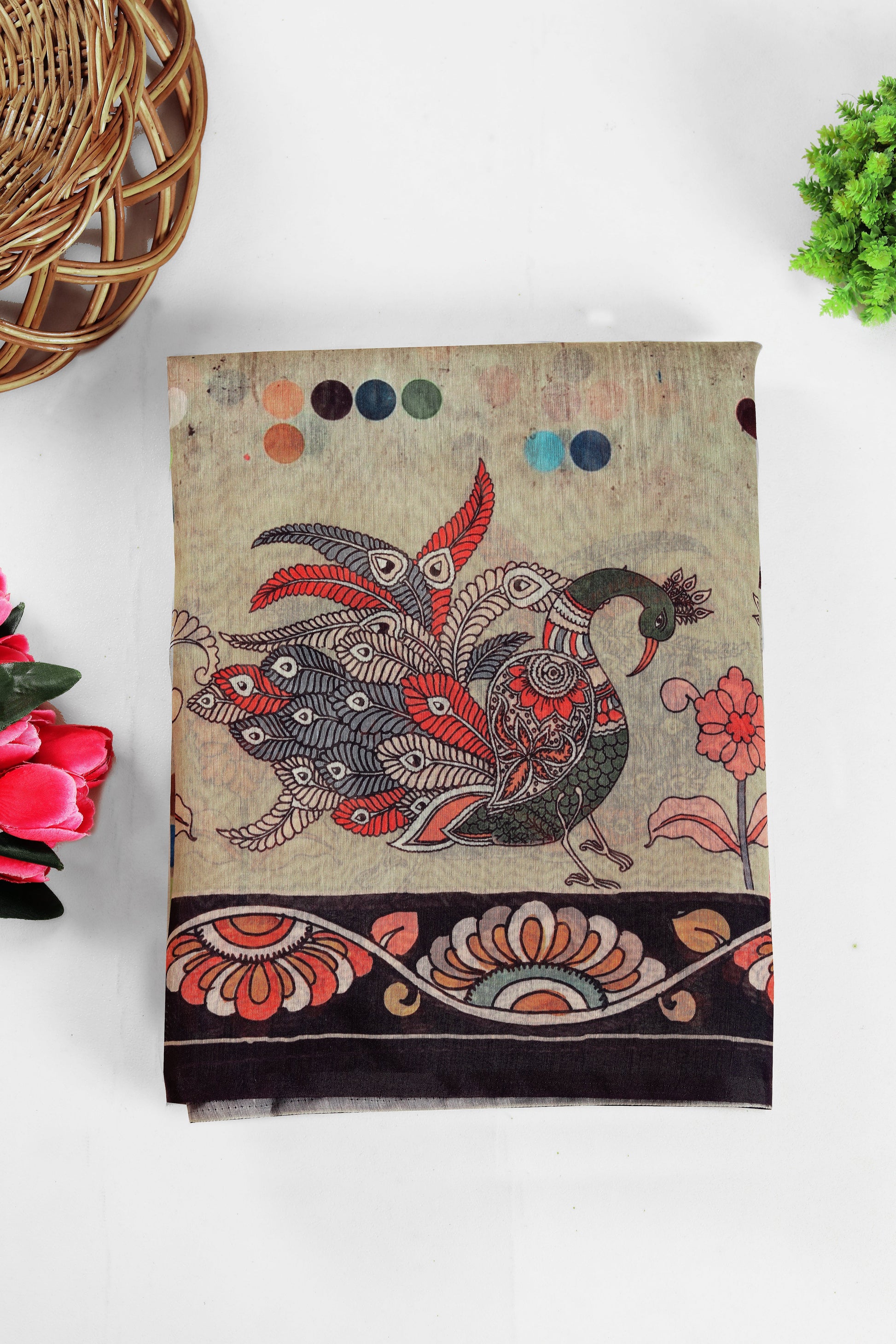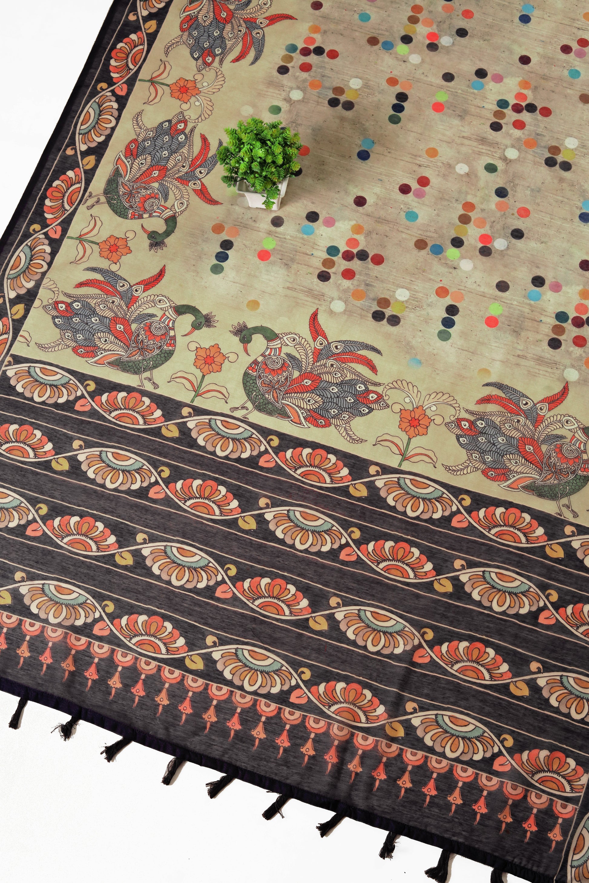 This saree elegantly combines the regal beauty of peacocks ("Mayura") with a contemporary, dotted ("Bindu") pattern. The border showcases intricately designed peacocks, a classic Indian motif, while the body features a modern arrangement of dots, creating a harmonious blend of tradition and modernity.
