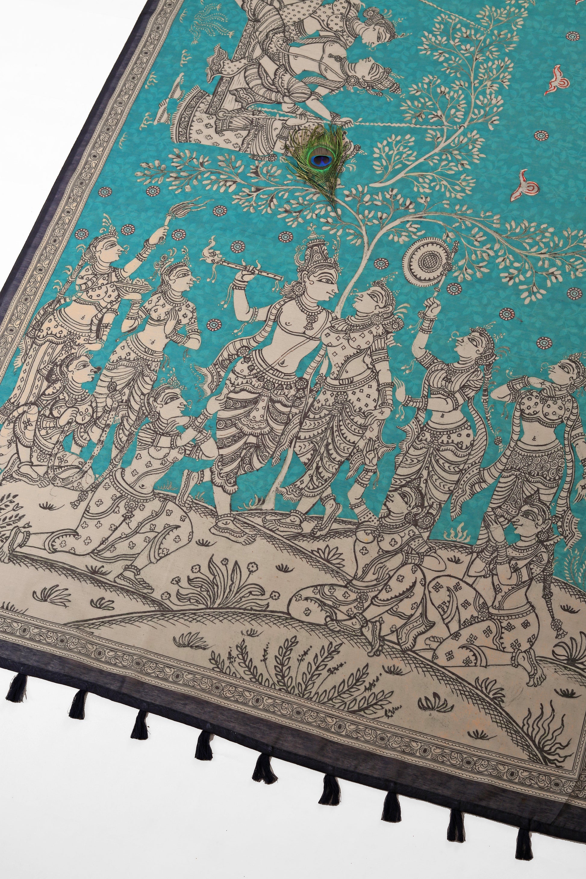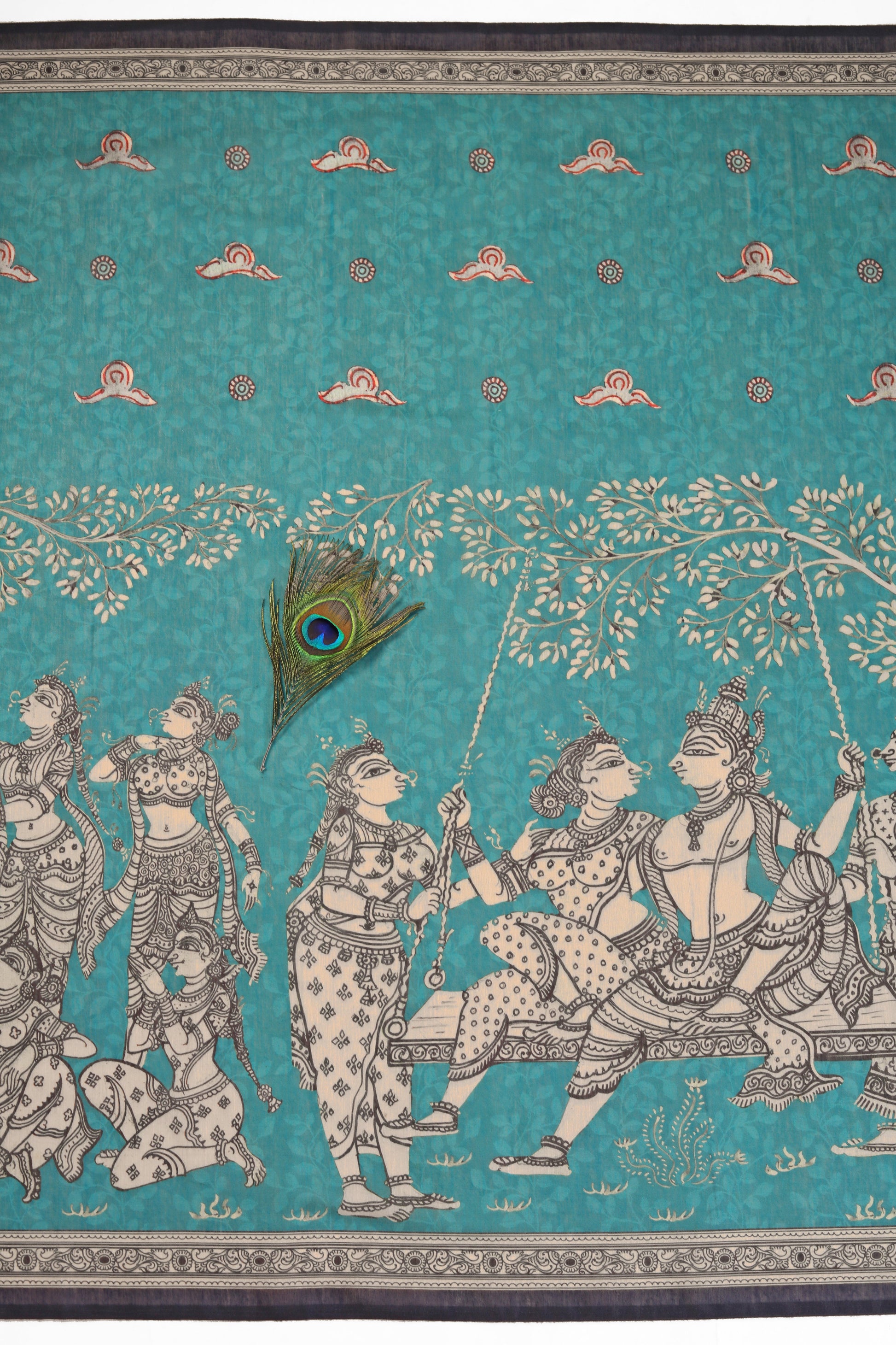 Celebrate the divine music of Vrindavan with the Muralika Sabha Chanderi Cotton Saree. This exquisite piece features Krishna playing his flute under a flowering tree, surrounded by graceful Gopis in a sabha-like gathering, beautifully captured in temple mural style on a vibrant turquoise base.