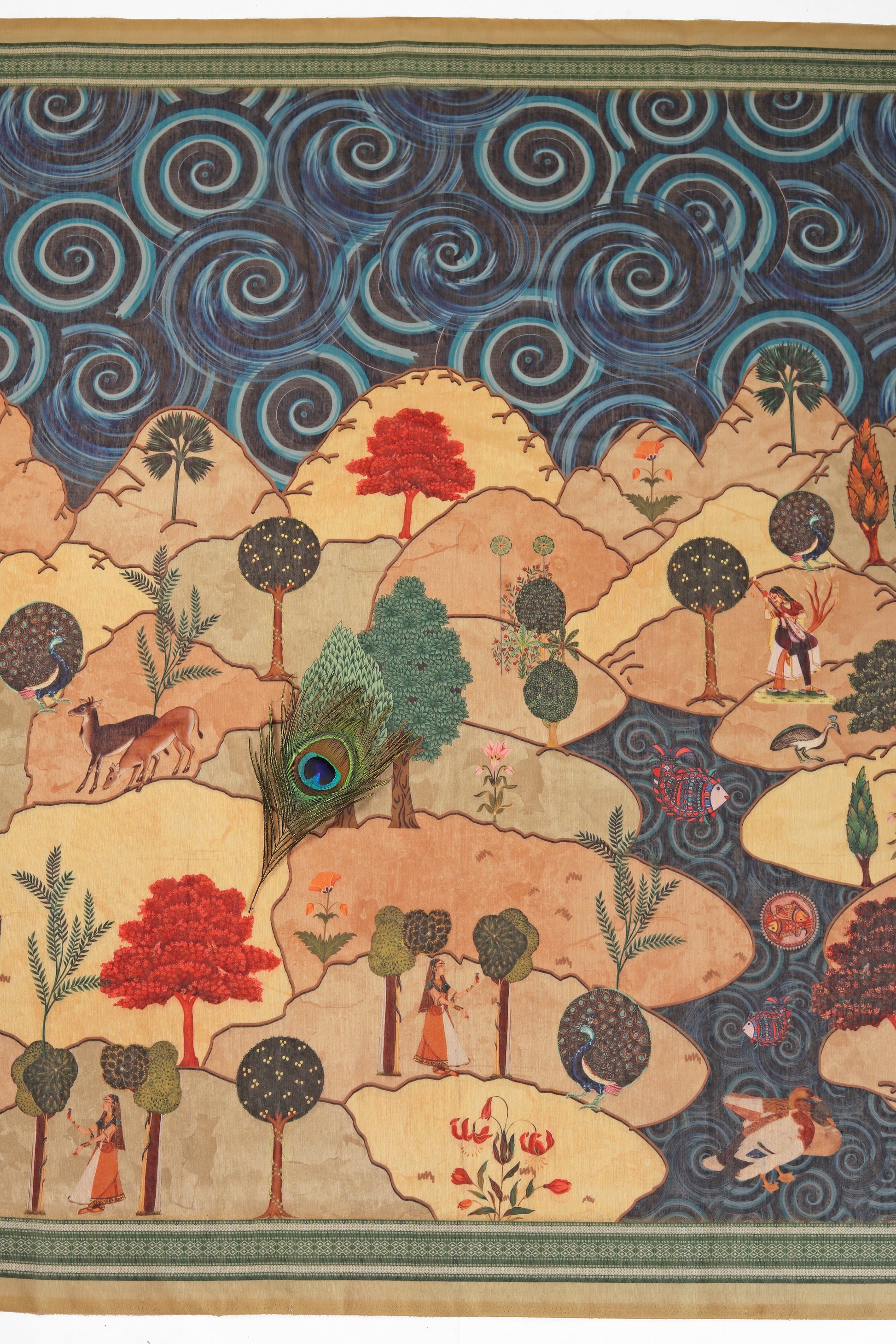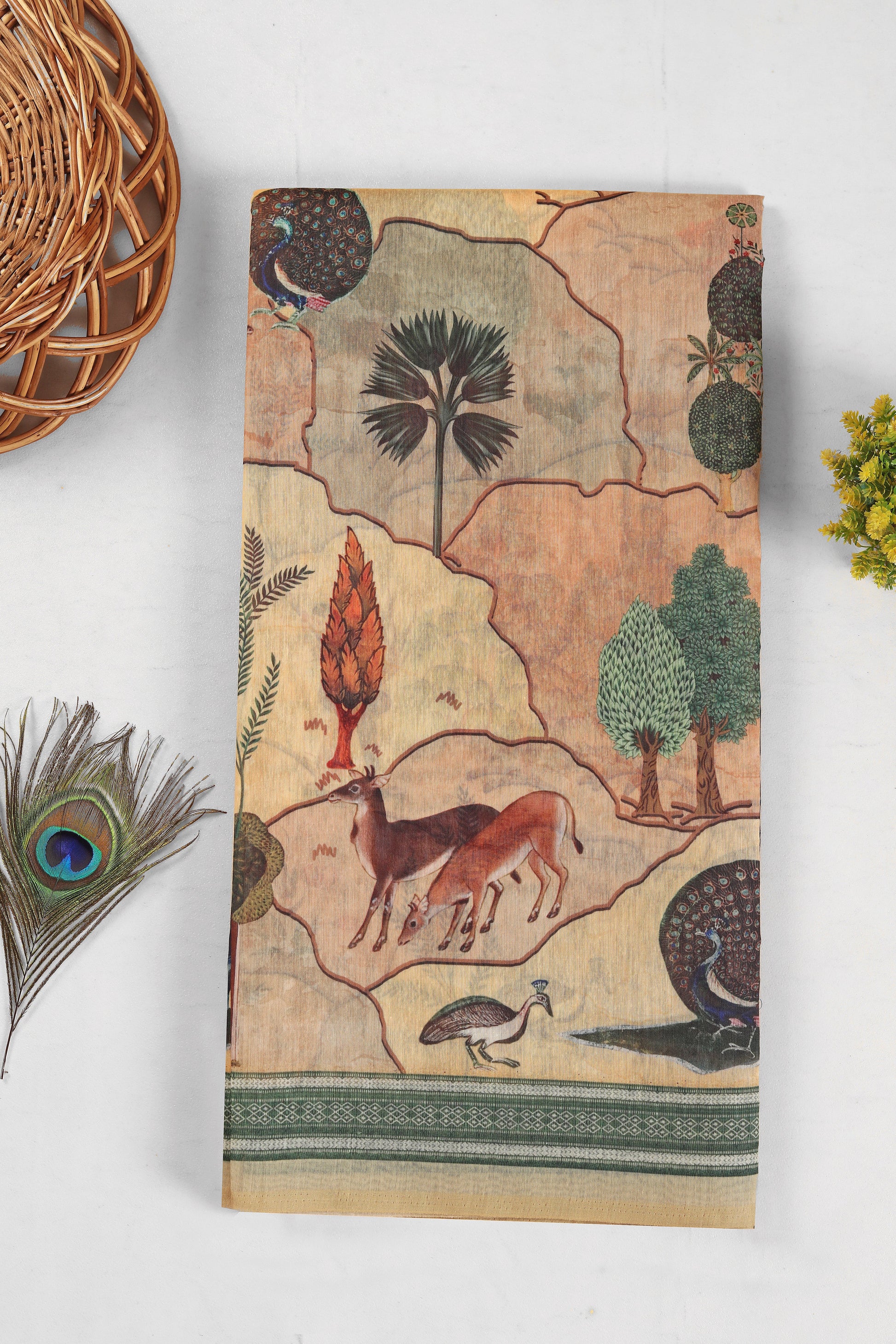 Bring the beauty of nature to your wardrobe with the Prakriti Varnan Chanderi Cotton Saree. This masterpiece features a serene depiction of forests, wildlife, and flowing water, turning the drape into a canvas of creation. The earthy beige tones merge with swirling blues, creating the perfect balance between land and river.
