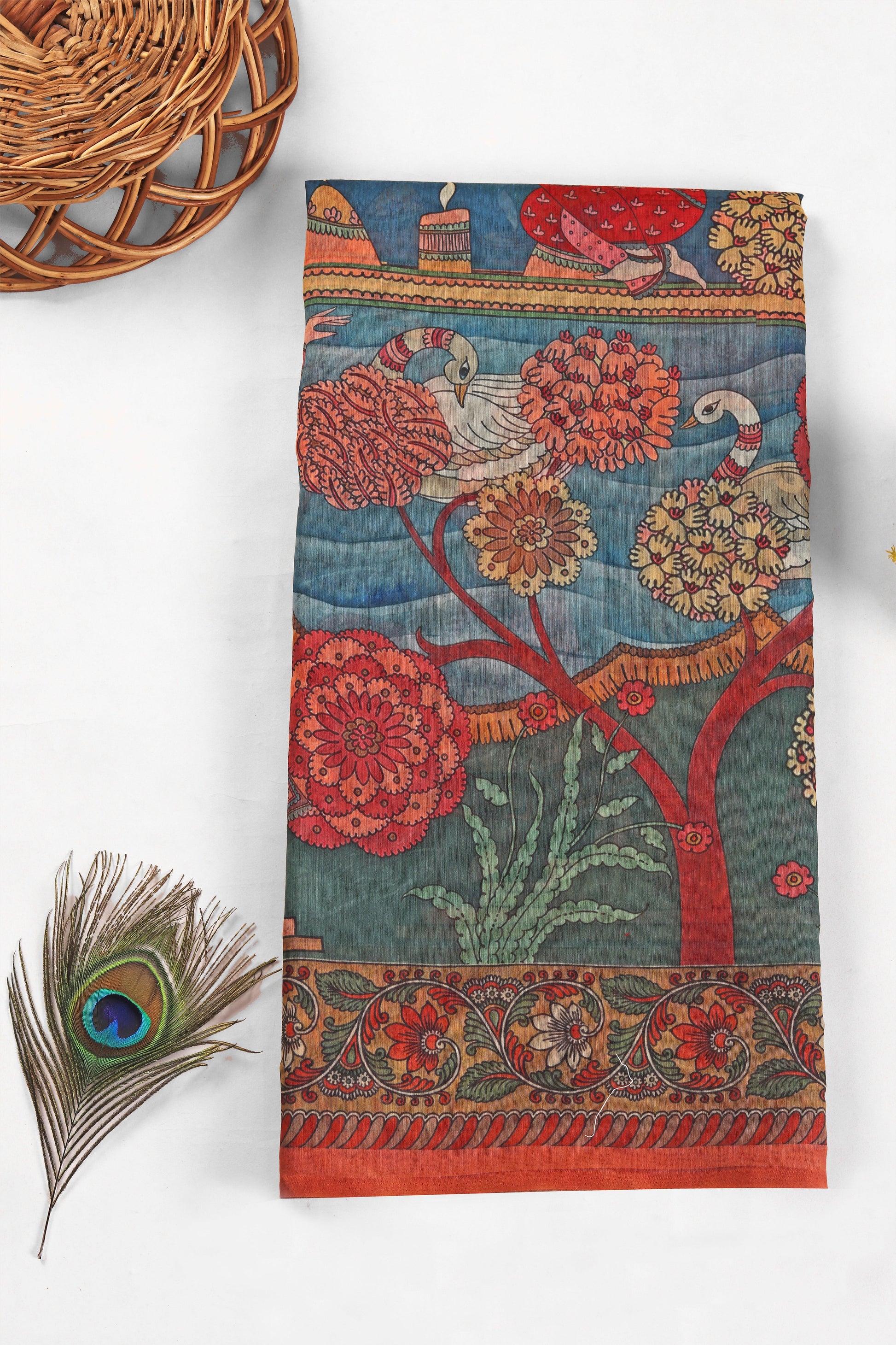 Step into the eternal charm of Vrindavan with our Prema Raas Chanderi Saree. Adorned with mythological Rasleela scenes of gopis, musicians, and divine motifs, this lightweight Chanderi cotton saree celebrates love, devotion, and festive grandeur. Perfect for cultural gatherings, temple visits, and traditional occasions.