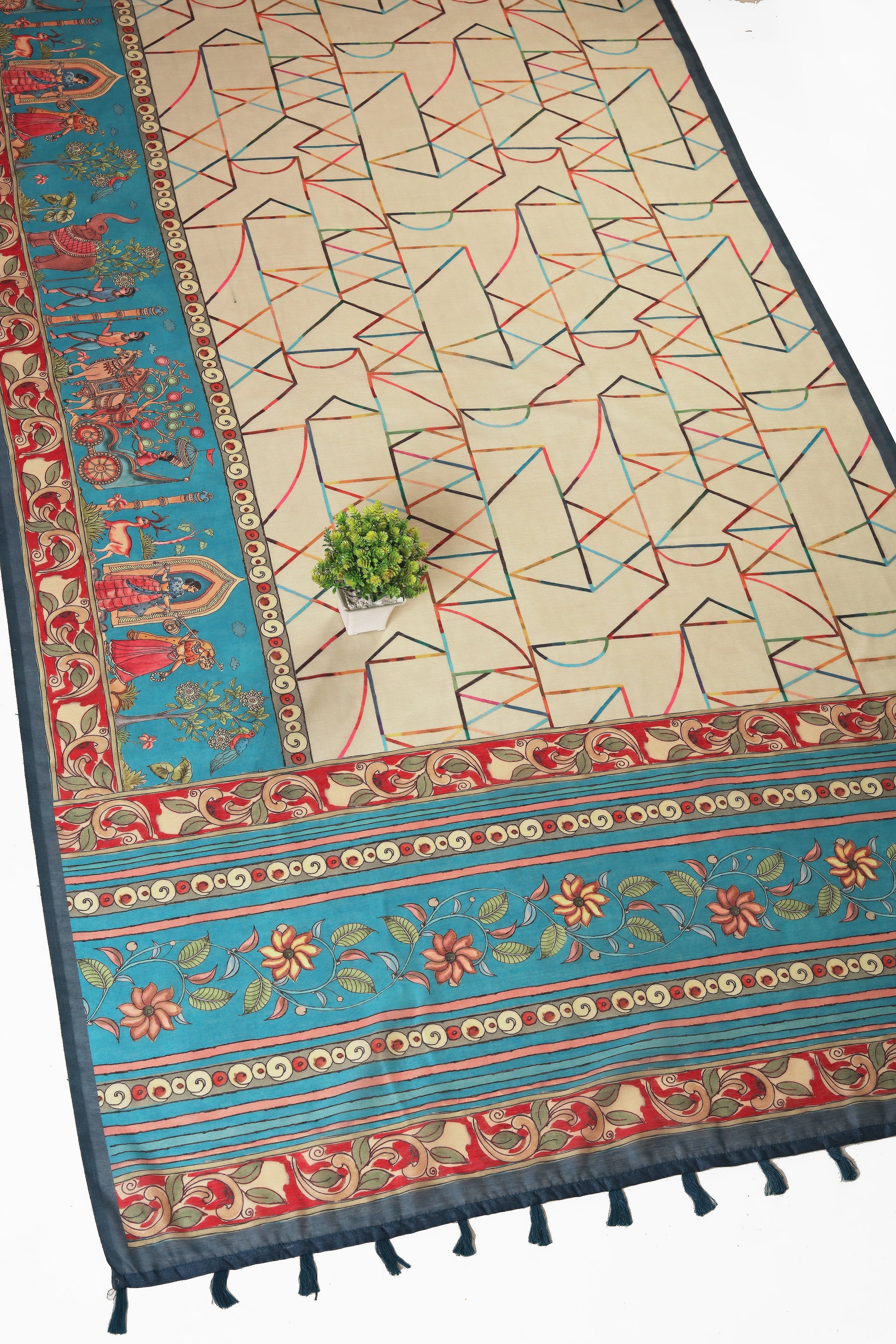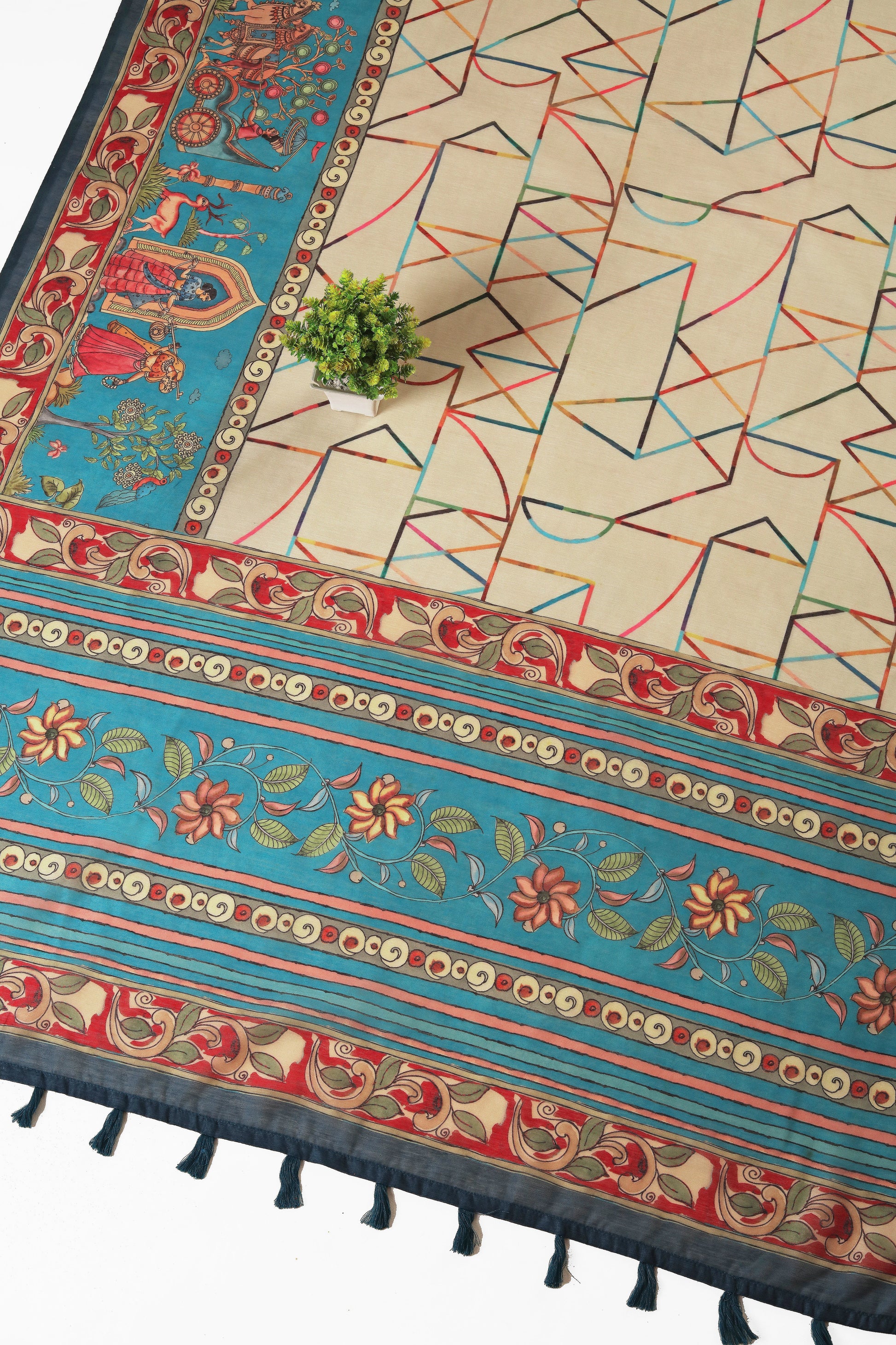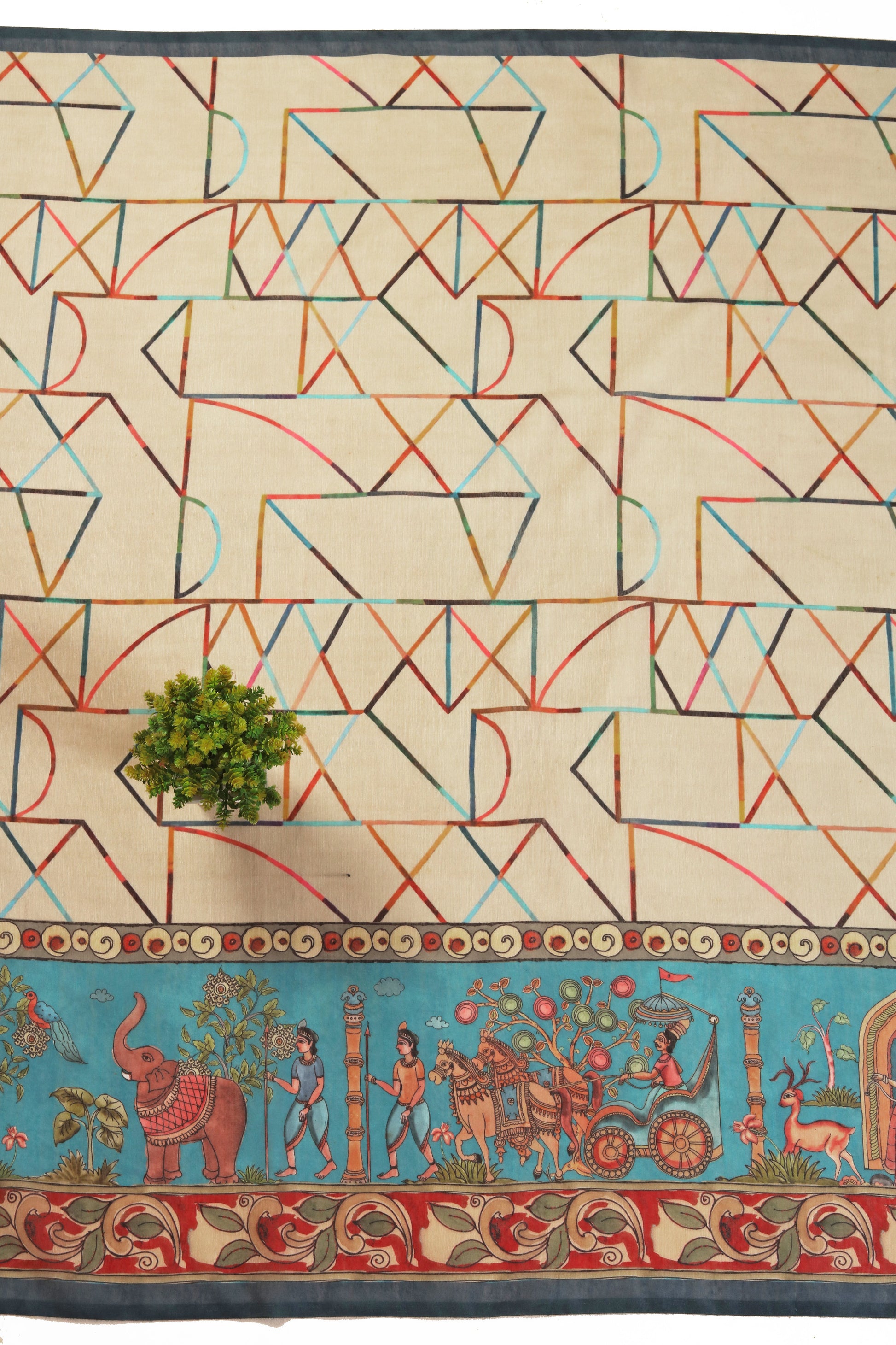 This saree masterfully blends vibrant "Rang" (colors) with intricate "Chhaya" (patterns), showcasing a harmonious fusion of traditional and modern design. The geometric lines create a contemporary visual rhythm, while the detailed floral and narrative borders add a touch of classic Indian artistry, making it a truly unique piece.