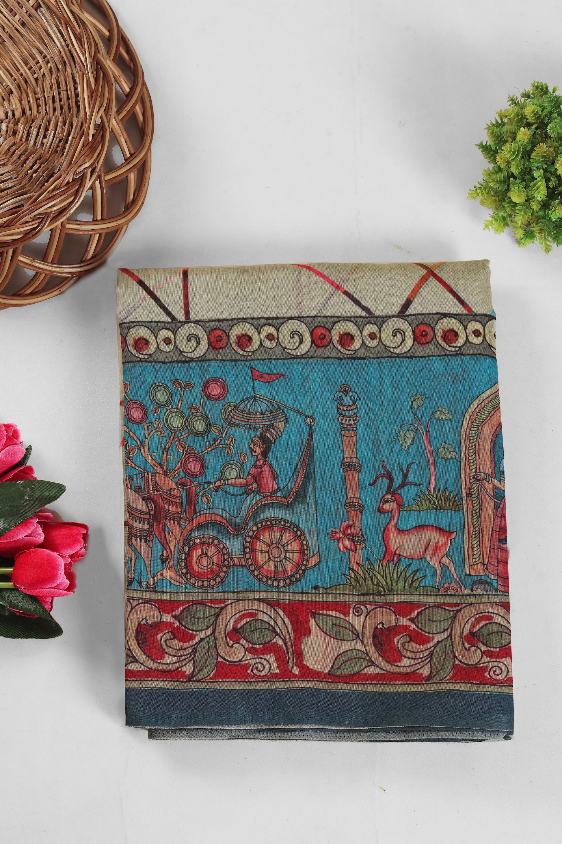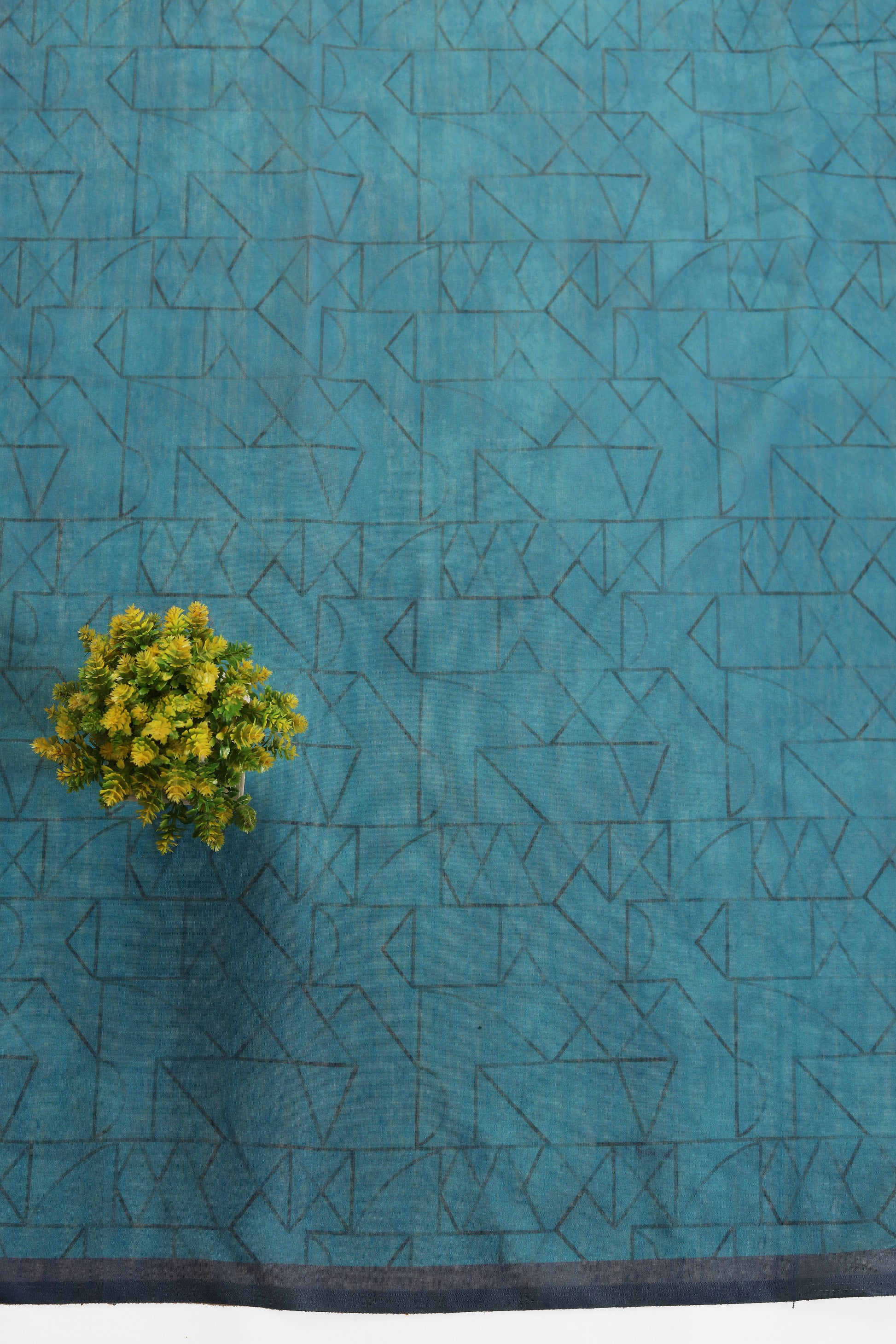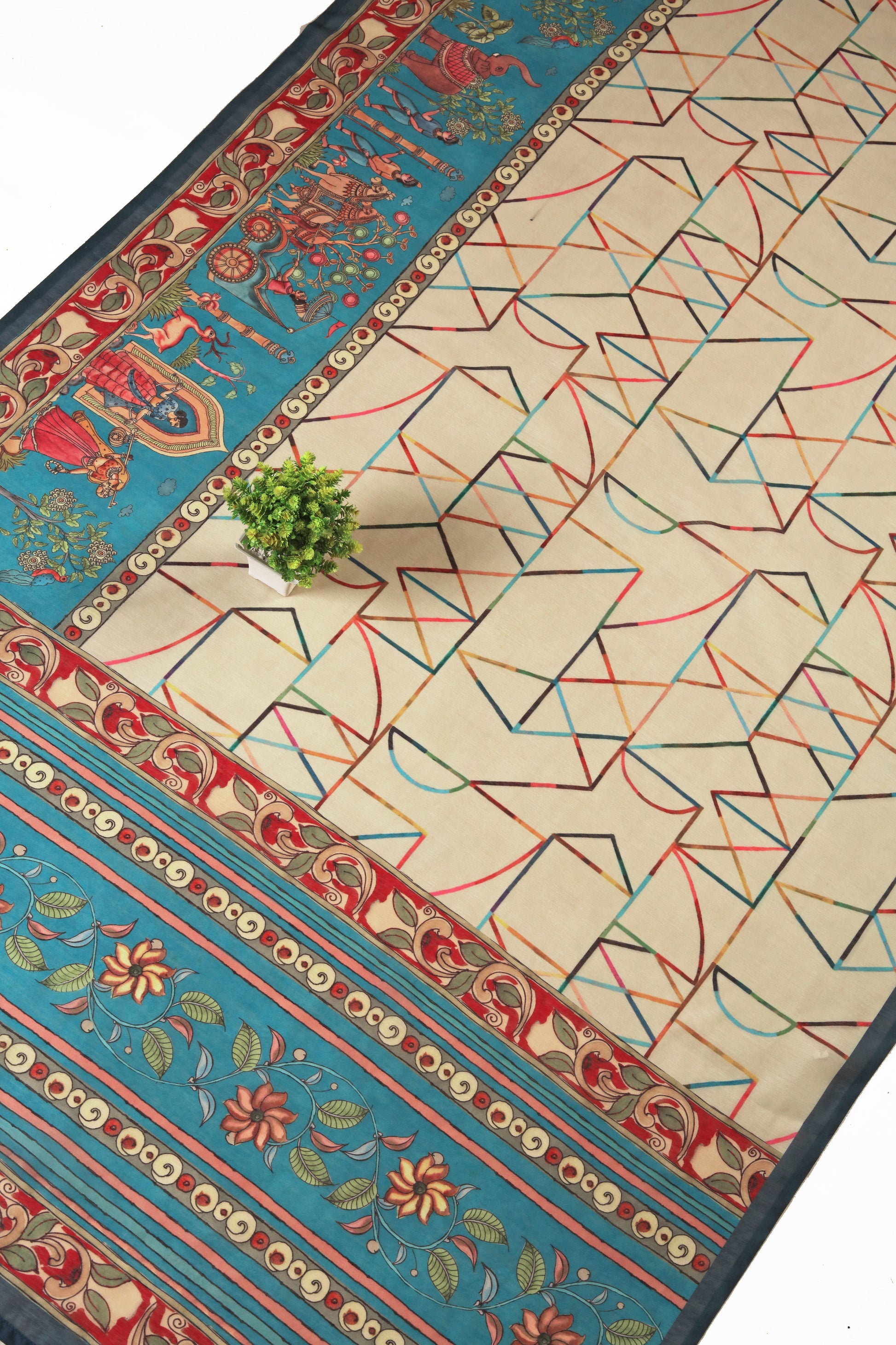This saree masterfully blends vibrant "Rang" (colors) with intricate "Chhaya" (patterns), showcasing a harmonious fusion of traditional and modern design. The geometric lines create a contemporary visual rhythm, while the detailed floral and narrative borders add a touch of classic Indian artistry, making it a truly unique piece.